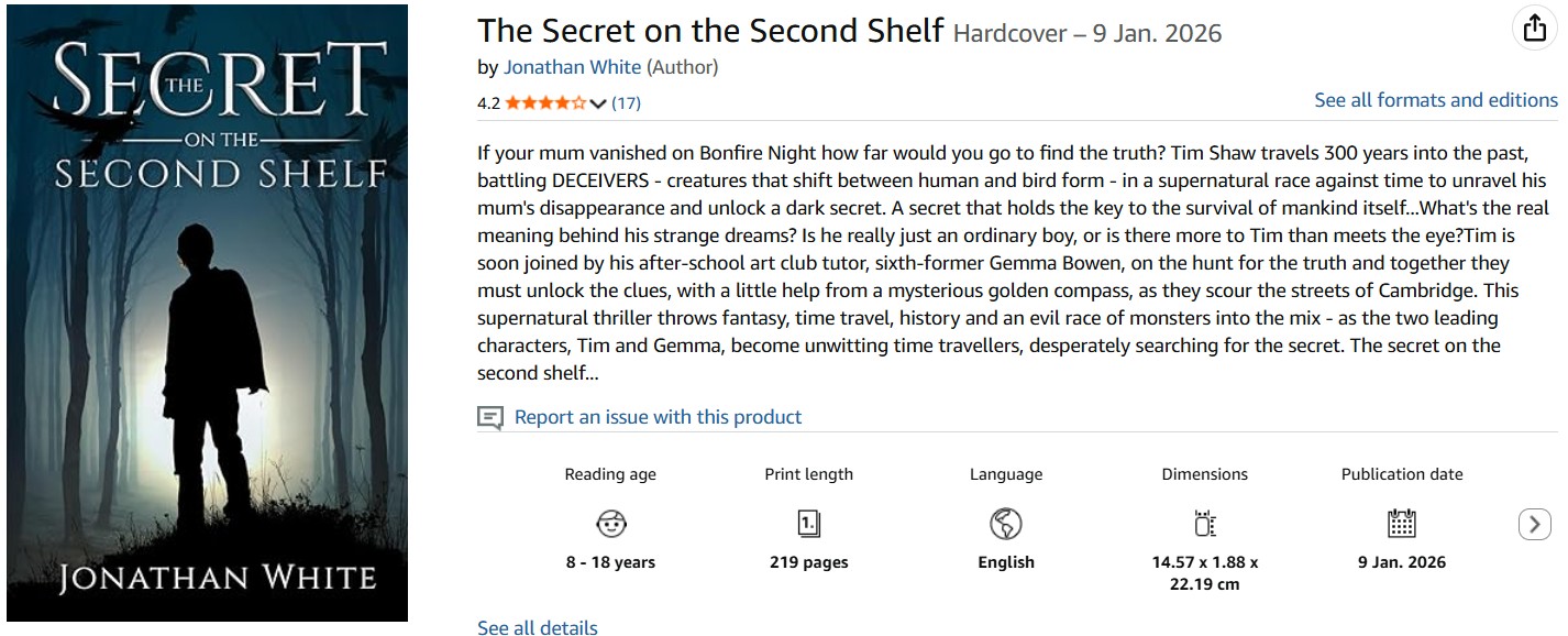 It’s more than 10 years ago that the Kindle version of Secret On The Second Shelf was released. Doesn’t time fly when you’re having fun! I’m pleased to announce that as of the 9th January 2026, you can enjoy the hardcover version.