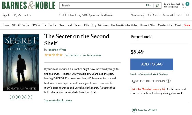 The Secret on the Second Shelf – available in Barnes & Noble Posted on January 10, 2017January 10, 2026 Jon Was super excited to find out today that one of America’s biggest bookstores has The Secret on the Second Shelf available for order!